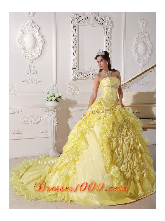 Luxurious Beaded Strapless Chapel Train Quinceanera Dresses Taffeta