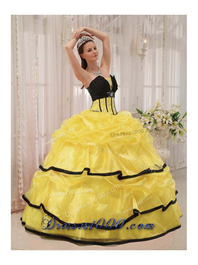 Yellow and Black Strapless Organza Quinceanera Gown Dresses with Beading