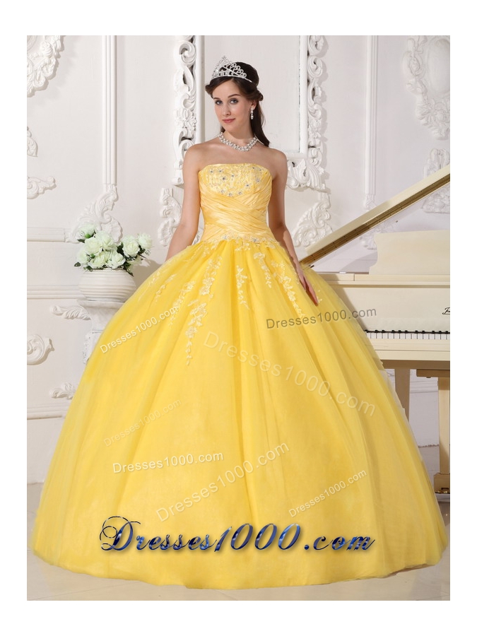 Puffy Strapless Appliques Quinceanera Gowns in Yellow