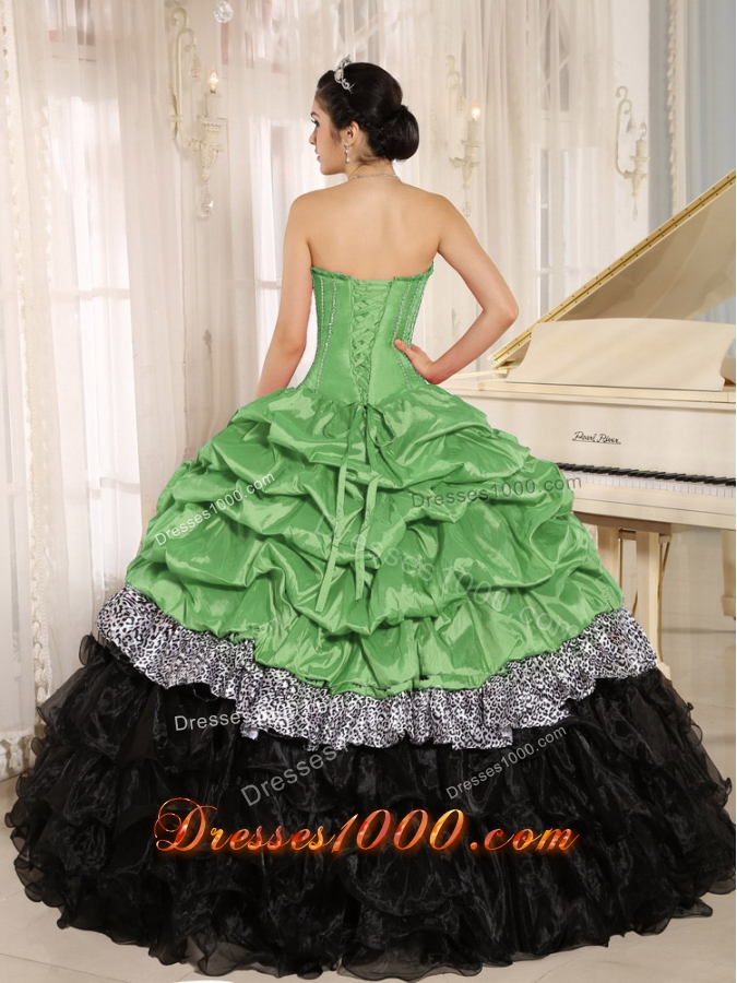 Fuller dress with more ornate designs are becoming more popular. This one is a gorgeous example of what we mean. Classical body-hugging bodice has front boning details made of beading and accents the vintage style. This dazzling Green quinceanera dress features a modified sweetheart neckline with folds and eye-catching leopard fabric on the top of bustline and full skirt. Multi-tiered ruffles of different fabrics give a sense of luxury. A lovely lace up back completes the look.
