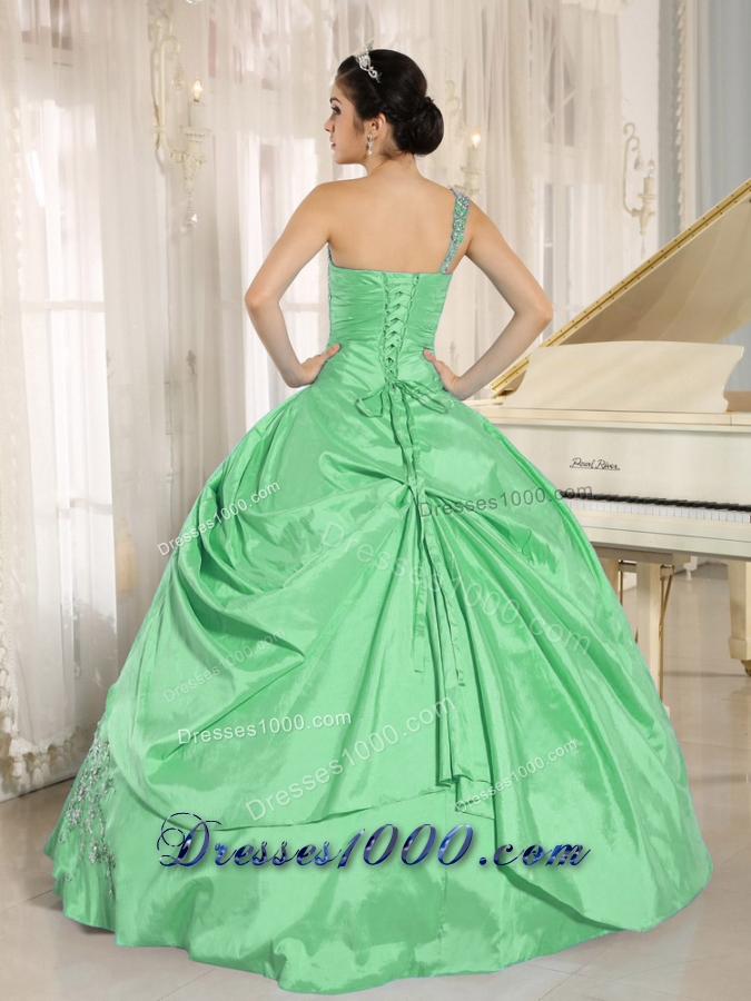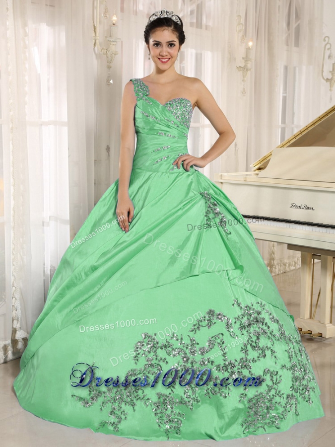 Perfect Green One Shoulder Appliques and Beading Quinceanera Dress