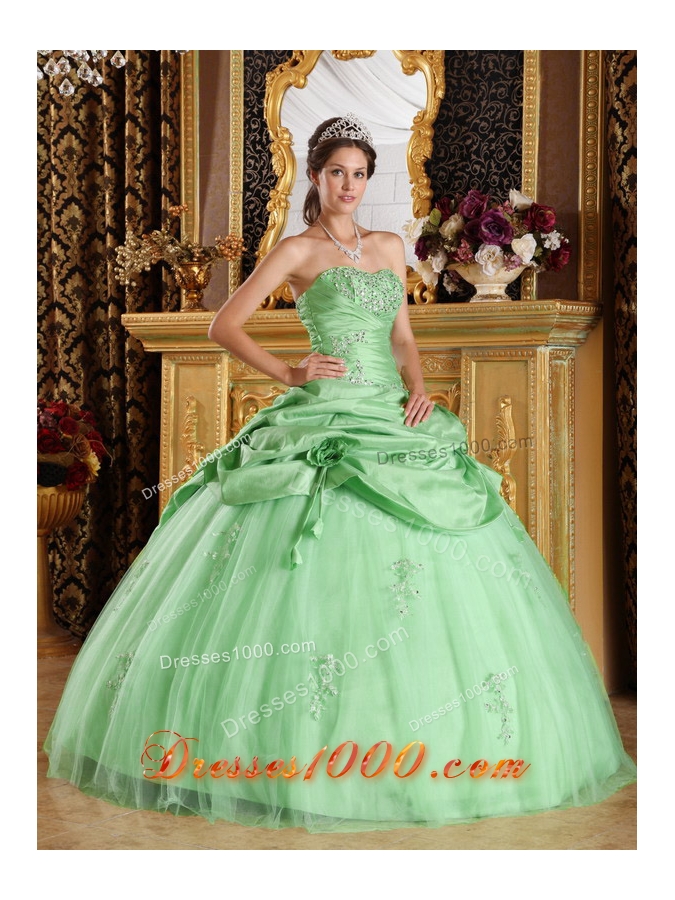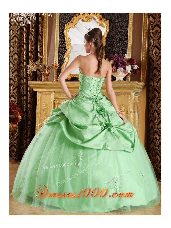 Perfect Quinceanera Dress in Apple Green Ball Gown Strapless with Beading and Hand Made Flower