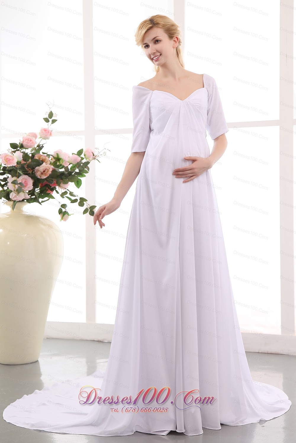 A simple cut dress with no elegance lacked! It will be quite comfortable to wear with a pleated bodice and half-length sleeves. The empire skirt starts from a high waistline which is just beneath the bust curves any figure. The court train adds interest and glamour to this design. The back completes with a fabulous zipper up closure.