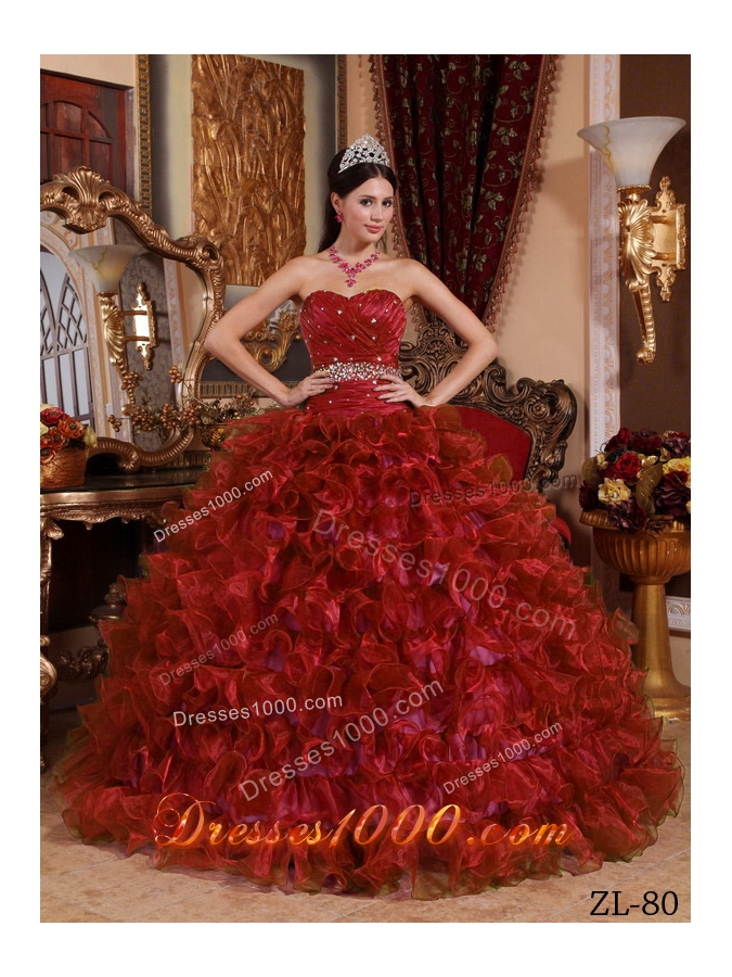 Puffy Sweetheart Organza Ruffles and Beading Wine Red Dresses Of 15