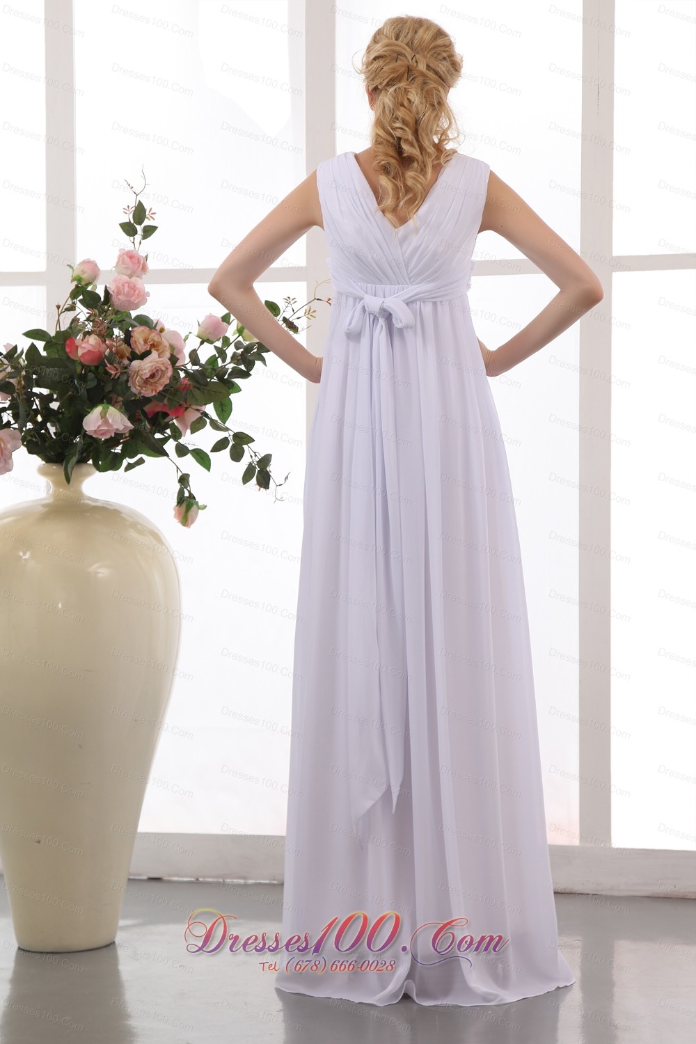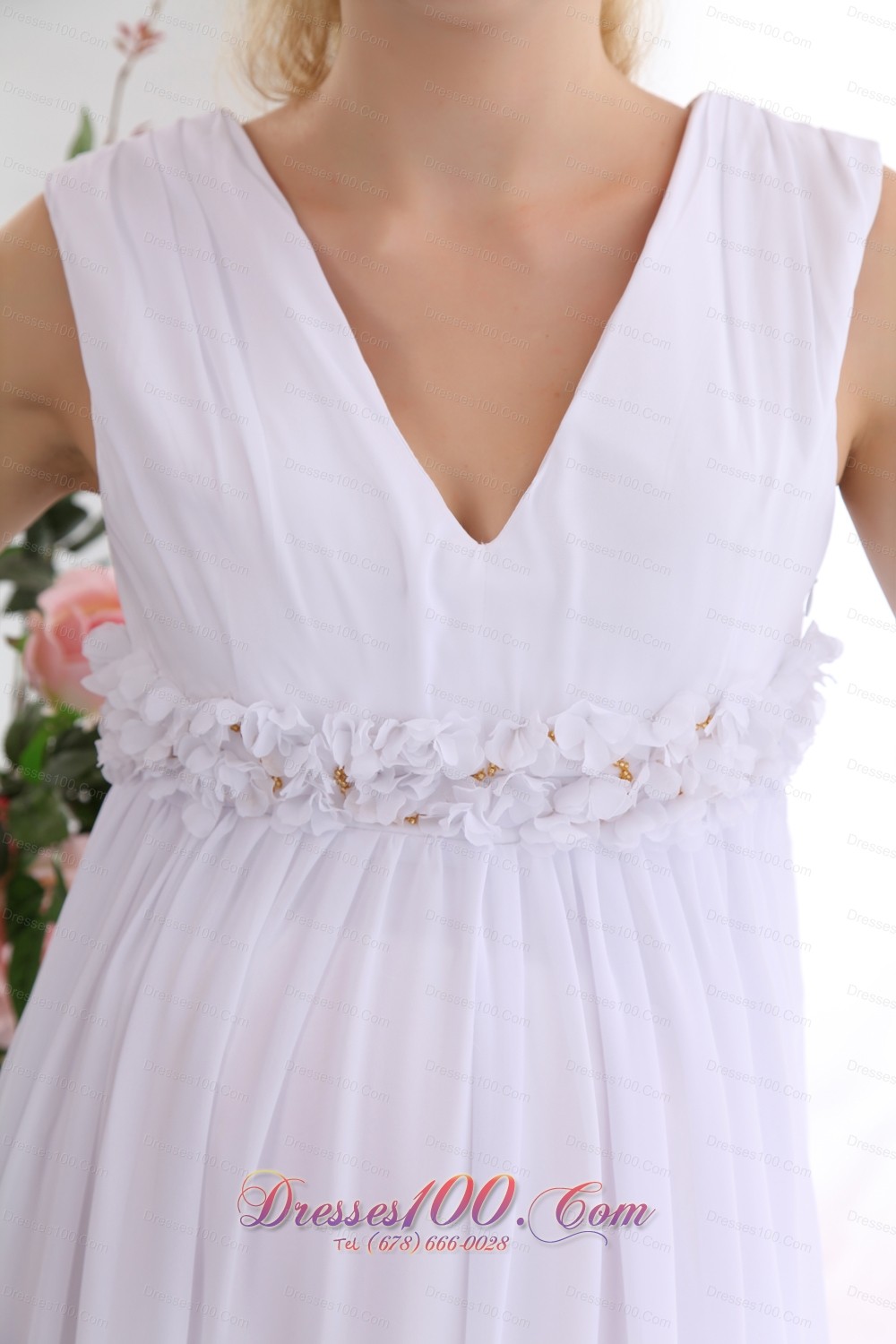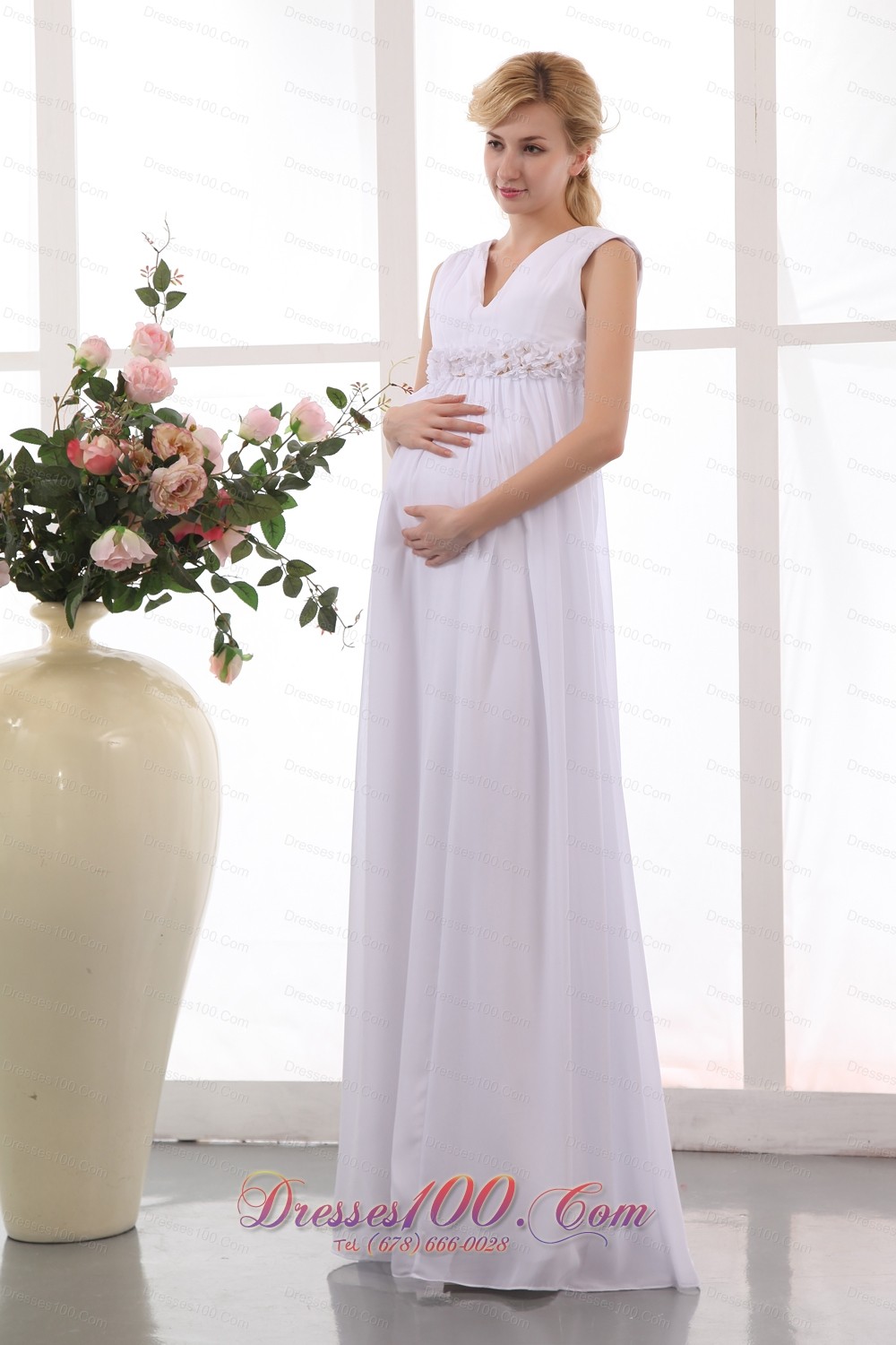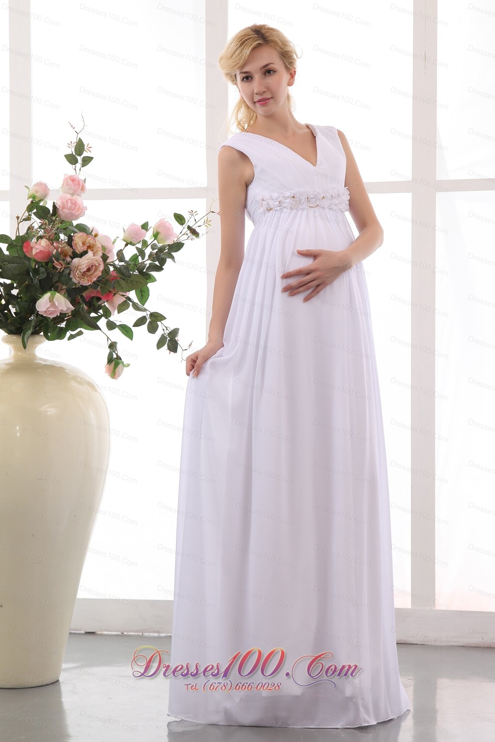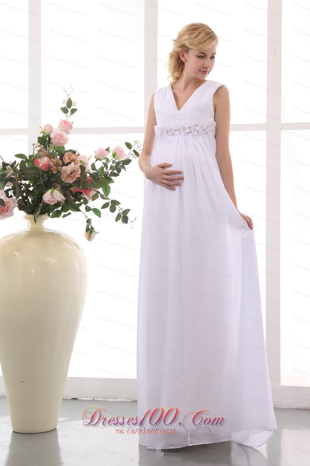 If you have a baby before your wedding this dress is the best choice for you. It features cap sleeves and forms a V neckline the classy petal shaped ornament on the waistline will make you to as graceful as the godness.The versatile skirt is textured as well as comfortable. A hidden zipper makes for easy off and on and secures the dress in place.