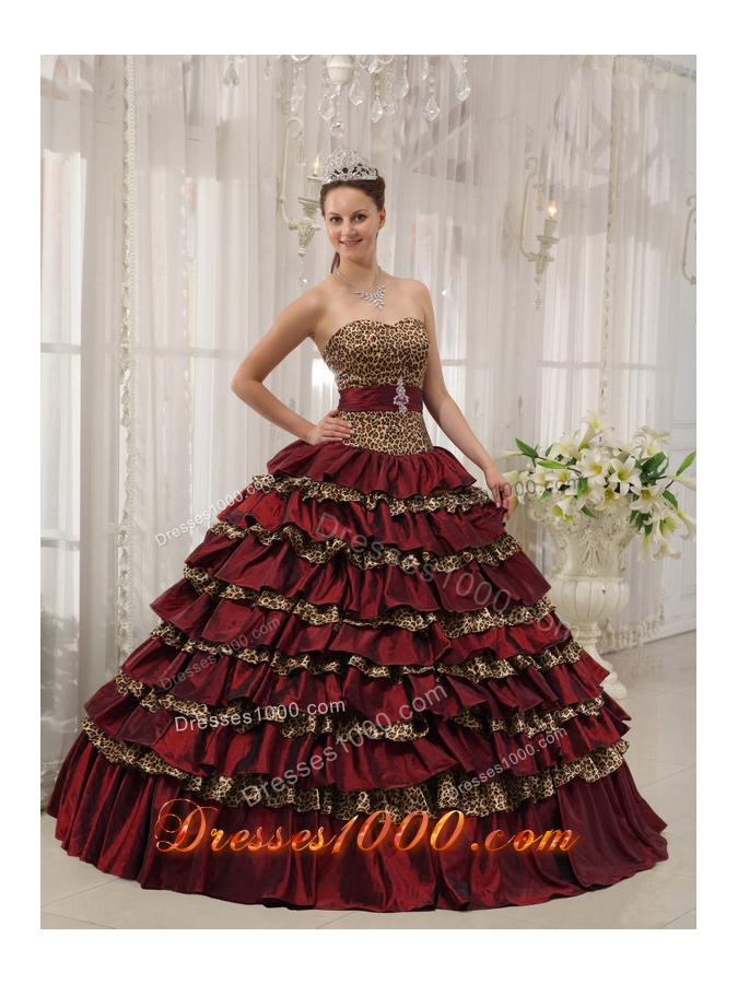 Princess Leopard Sweetheart Layers Burgundy Dresses Quinceanera