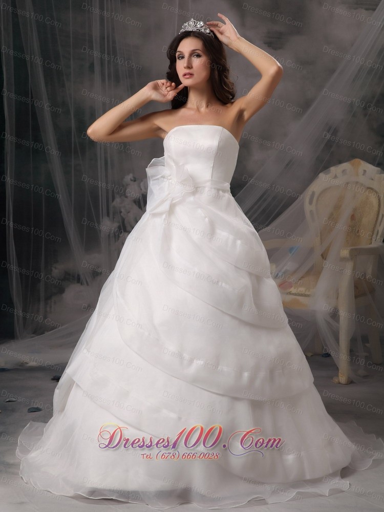 Channel your inner glamour girl wearing this wedding gown. This strapless fitted bodice is spiced up by a bold and avish bow on the empire waist.The skirt is full with bustled details in diagonal lines and a pronounced A-line shape. The many-layered skirt falls in liquid lines to an expansive full-length.The flounced trim and a lovely chapel train create for a romantic look.