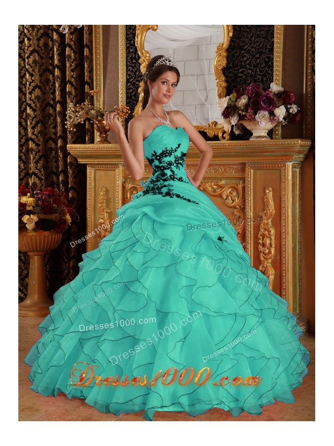 This amazing sweetheart neckline Turquoise quinceanera dress is accented with the flowing ruffles with black heamlines on the lower part of the coveTurquoise with specially designed pick ups. The rushed bust aera and the black appliques pointing upword on the bodice gives a strong visual impact.