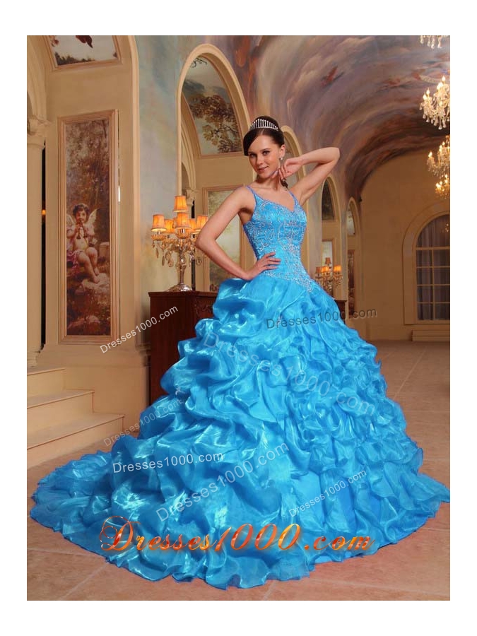 Aqua Blue Ball Gown Spaghetti Straps Quinceanera Dress with Organza Embroidery