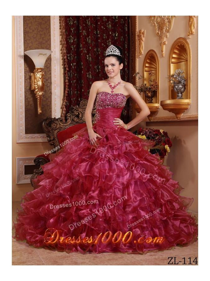 Red Strapless Organza Beading and Ruffles Quinceanera Dresses