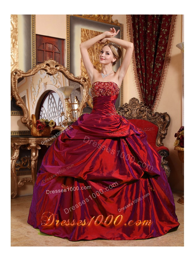 Strapless Taffeta Beading and Appliques Wine Red Quinceanera Dress