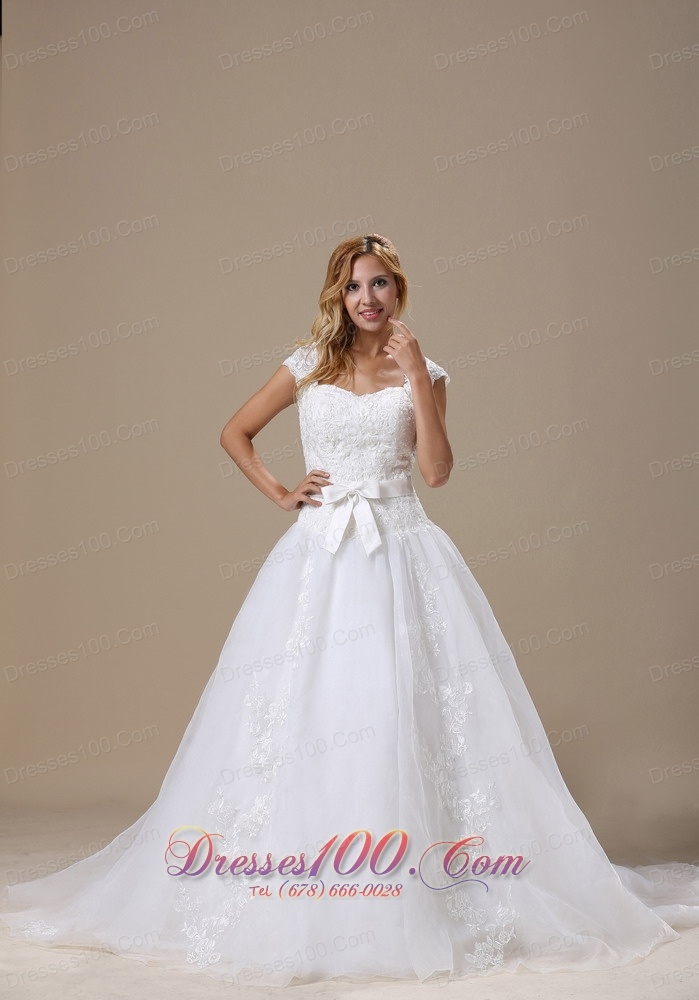 Square Cap Sleeves and Sash Wedding Dress Chapel Train