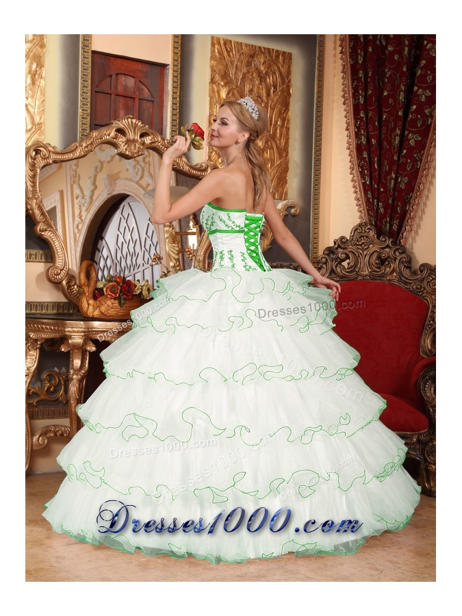 Love the dress at first sight! This brand new strapless white quinceanera dress is accented with the red edges decorating the ruffles on the bottom of the dress immaculately. The bodice is adorned with red straps criss crossed around the wasit and the intricate appliques above and below the complicated straps. Heads will trun to you in this flawless quinceanera dress.
