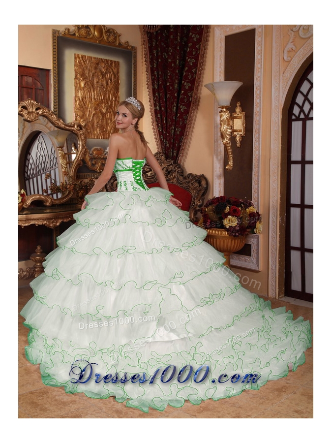White Puffy Strapless Detachable Train Layers Appliques Quince Dresses