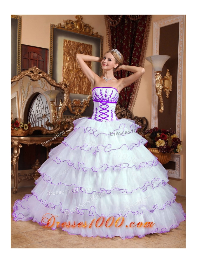 Strapless Detachable Train Organza Appliques White Quinceanera Dress with Layers