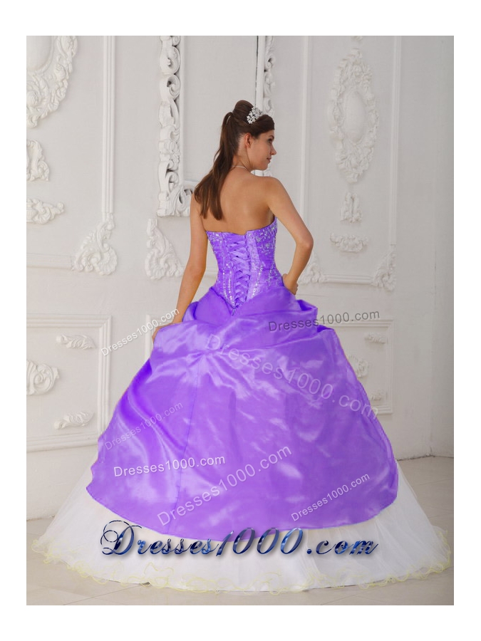 Dramatic elegance! Taffeta gown with a strapless neckline, fitted bodice is completely adorned with beading. Ultra-sophisticated hand made flower accents the left hip. Bright Purple taffeta top skirt with pick ups and a white tulle underskirt with a lace up back make this quinceanera gowns exquisite!