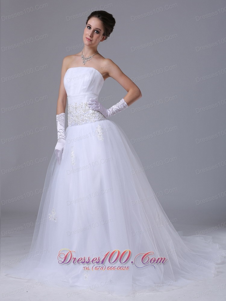 Indulge your fashion fantasies on your day of all days with this bridal creation! The strapless bodice features figure-hugging sectional construction and lovely appliques and bonings. The fully gathered skirt flares in layers of semi-sheer finery to a belling full-length. The characteristic tulle layer adds exceptional elegance.