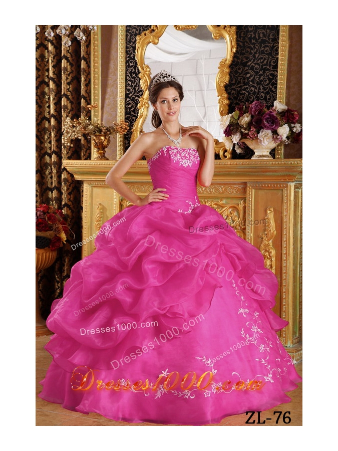 2014 Hot Pink Ball Gown Strapless Pretty Quinceanera Dresses with Embroidery