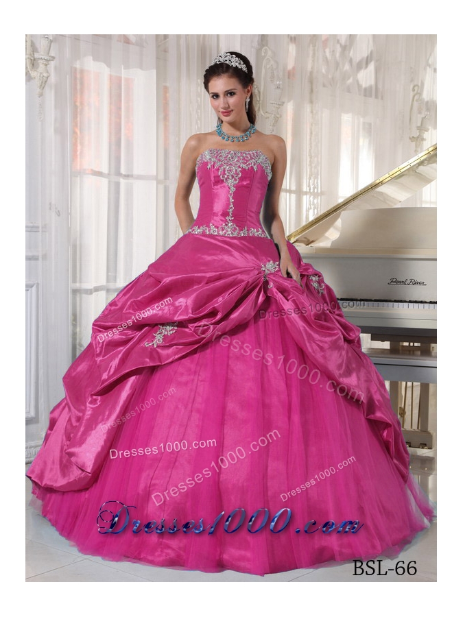 Hot Pink Ball Gown Strapless Quinceanera Dress with Taffeta Appliques