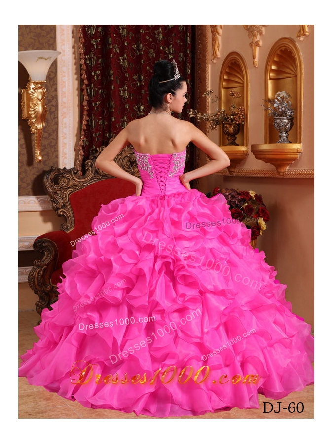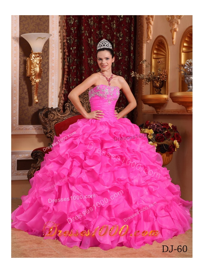 Rose Pink Ball Gown Strapless Quinceanera Dress with Organza Beading Appliques