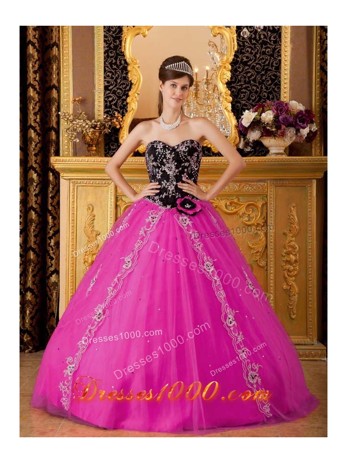 This romantic quinceanera gown features with a sweetheart neckline and a ball gown skirt. The bodice part defines the appliques with coloer beads do really an admirable design. Th e gown accents the appliques, in the front, the appliques scatter a v-line frame, togethered with the flower on the waist, do attract the appreated eyes. Layers of tulle makes you feel soft and smooth. The lace up back is the finishment of the dress. A gorgeous, graceful dress for you to choose.