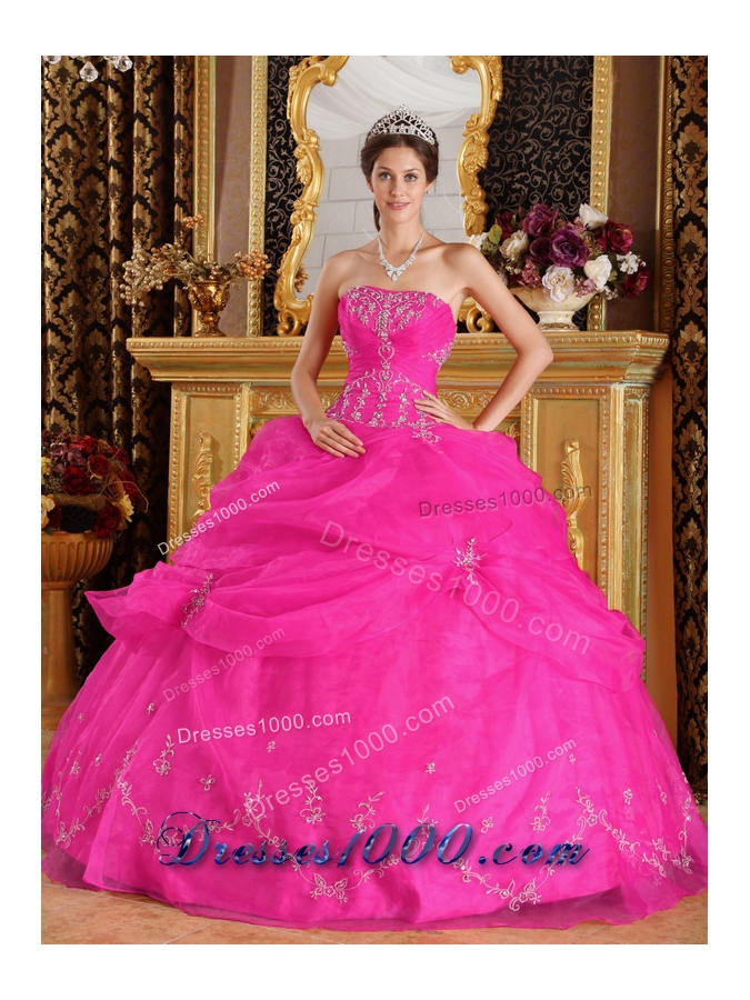 Hot Pink Ball Gown Strapless Quinceanera Dress with Organza Appliques