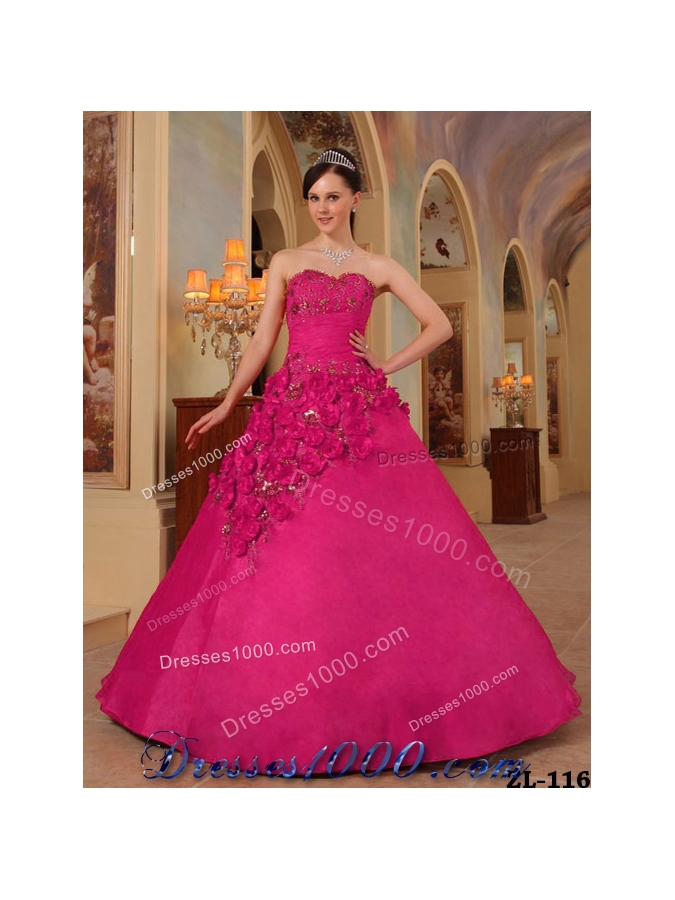 Coral Red Ball Gown Sweetheart Quinceanera Dress with Organza Handle Flowers