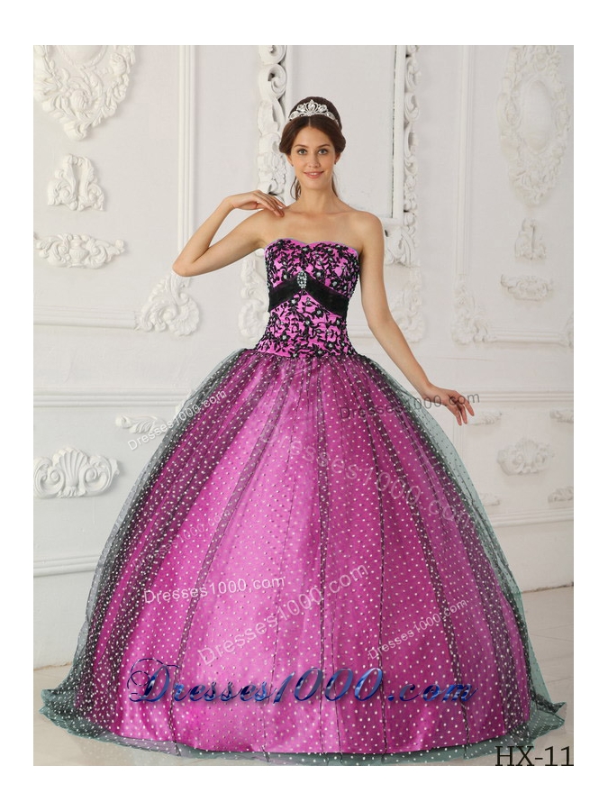 Black and Fuchsia Ball Gown Strapless Quinceanera Dress with Appliques