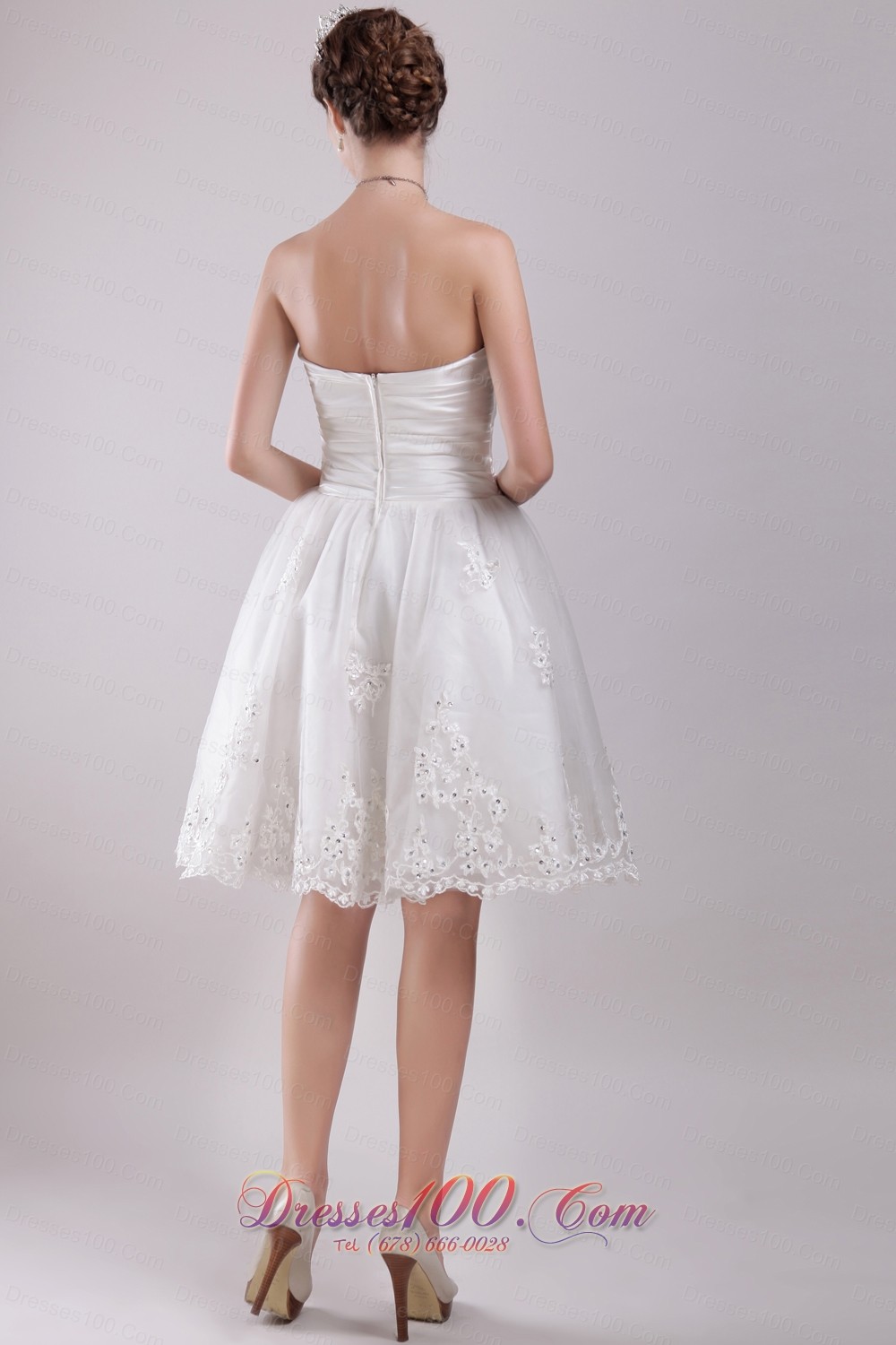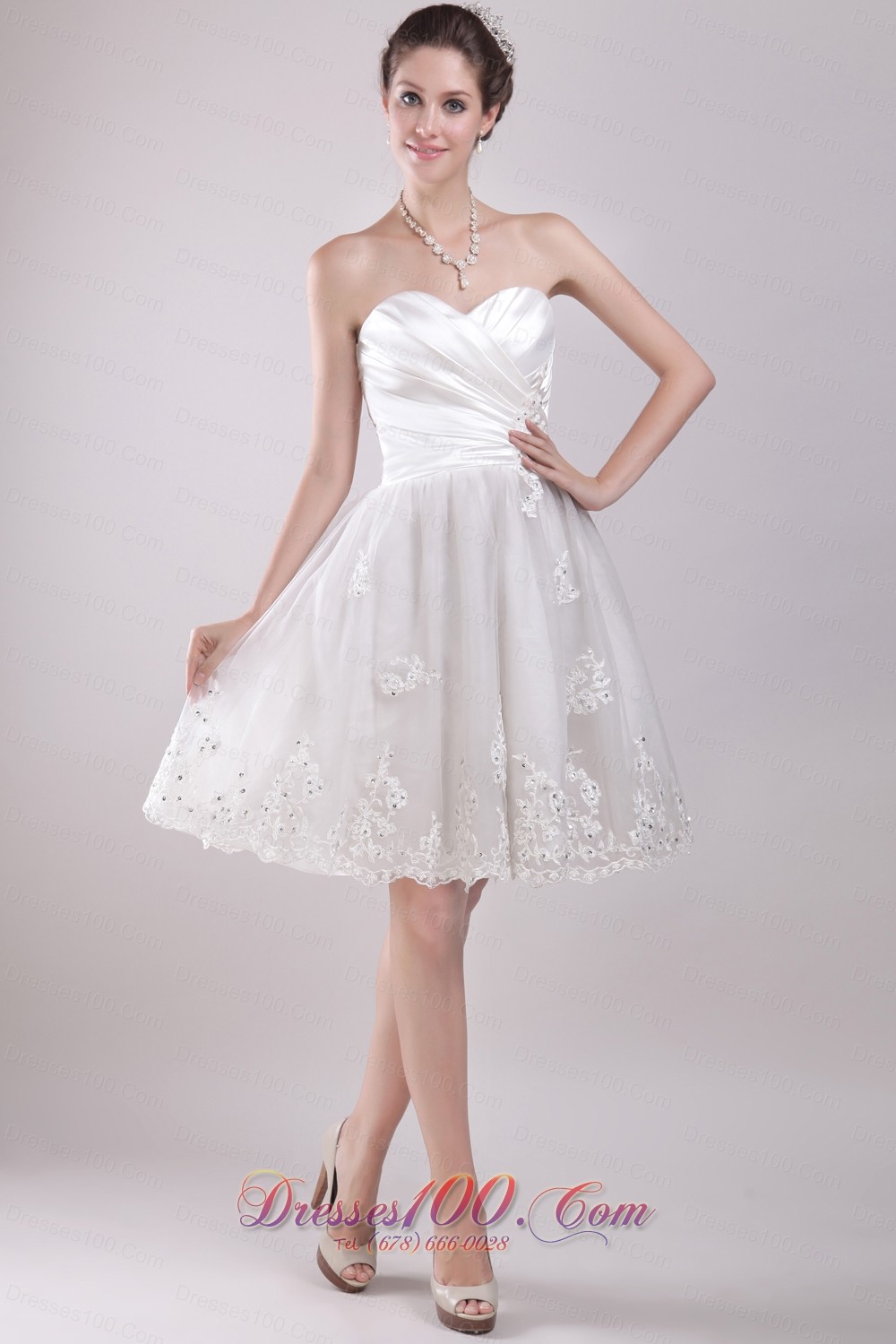 For the classical wedding dress, the short one is increasingly popular !The exquisite sweetheart and ruched bodice adorned with flora applique to creat an elegant silhouette. The skirt overlayed a fine flora appliques to the knee equally flatters for taller brides with long legs or shorter brides who want to appear taller on their special day.