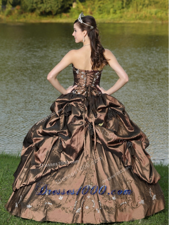 You cannot help but be charmed by this lovely strapless ball gown!Delicate floral appliqques between the bust and waist liven up the strapless bodice amazingly. The upper portion of the skirt is adorned with bubble pick ups which almost extends to the bottom. The skirt sweeps chicly to the floor. A corset back completes the look.