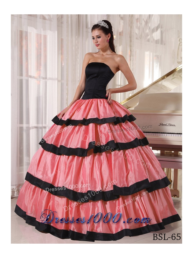 Watermelon and Black Ball Gown Strapless Dresses For a Quince with Ruffled Layers
