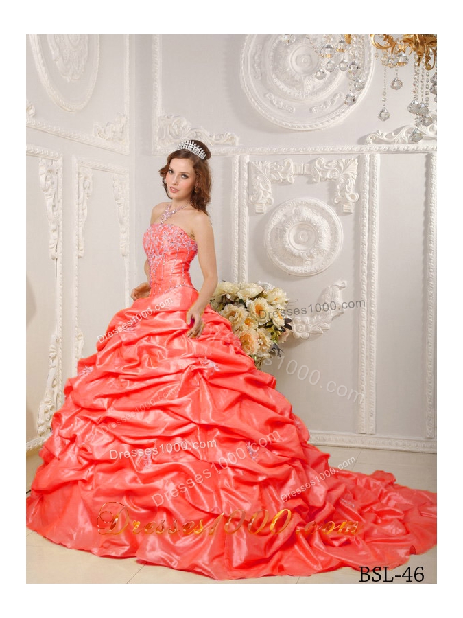 Orange Red Ball Gown Strapless Court Train Dresses For Quinceaneras with Appliques and Pick-ups