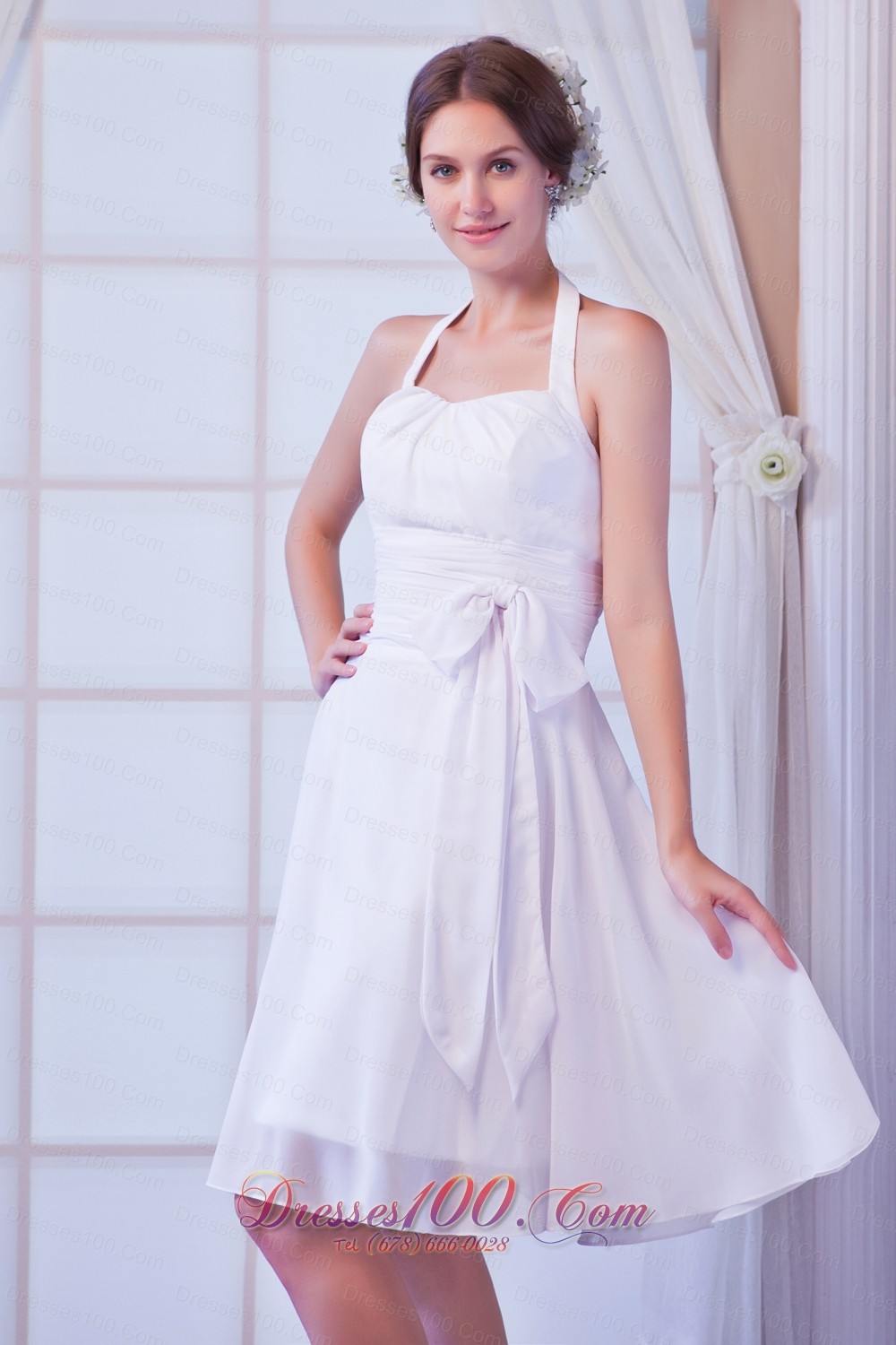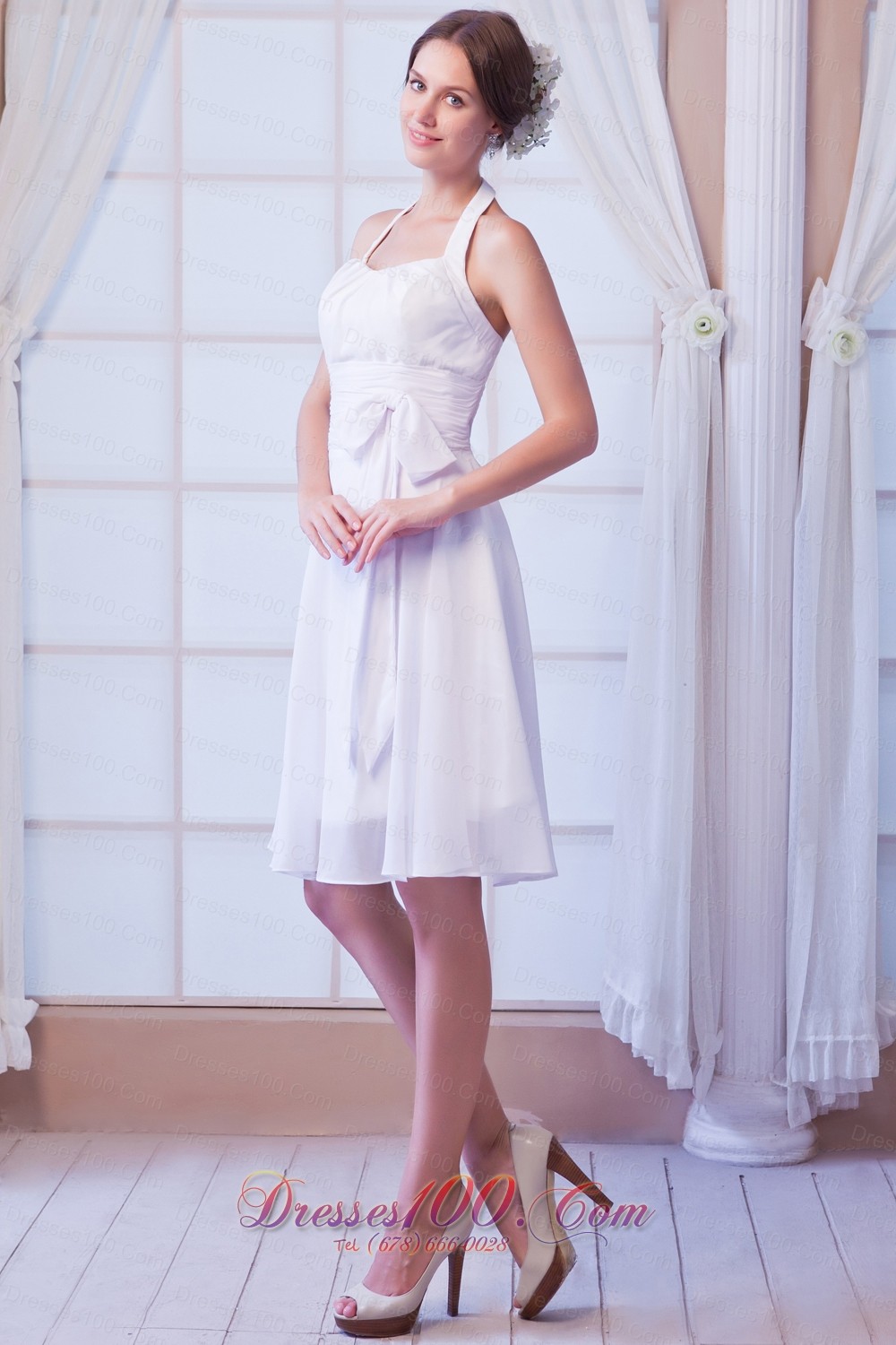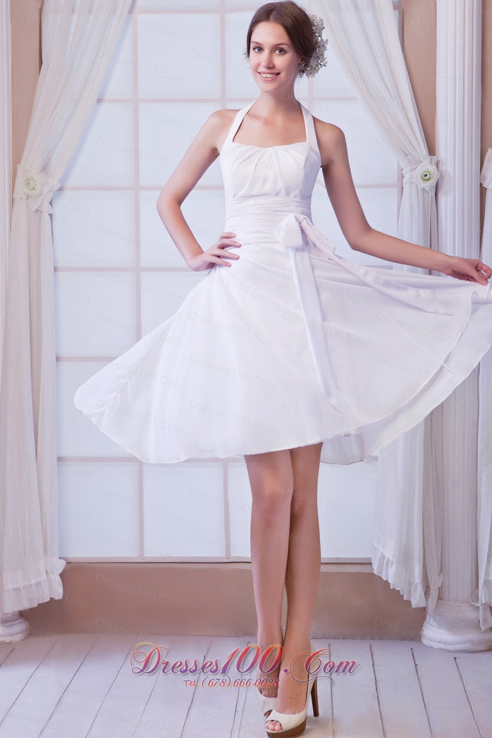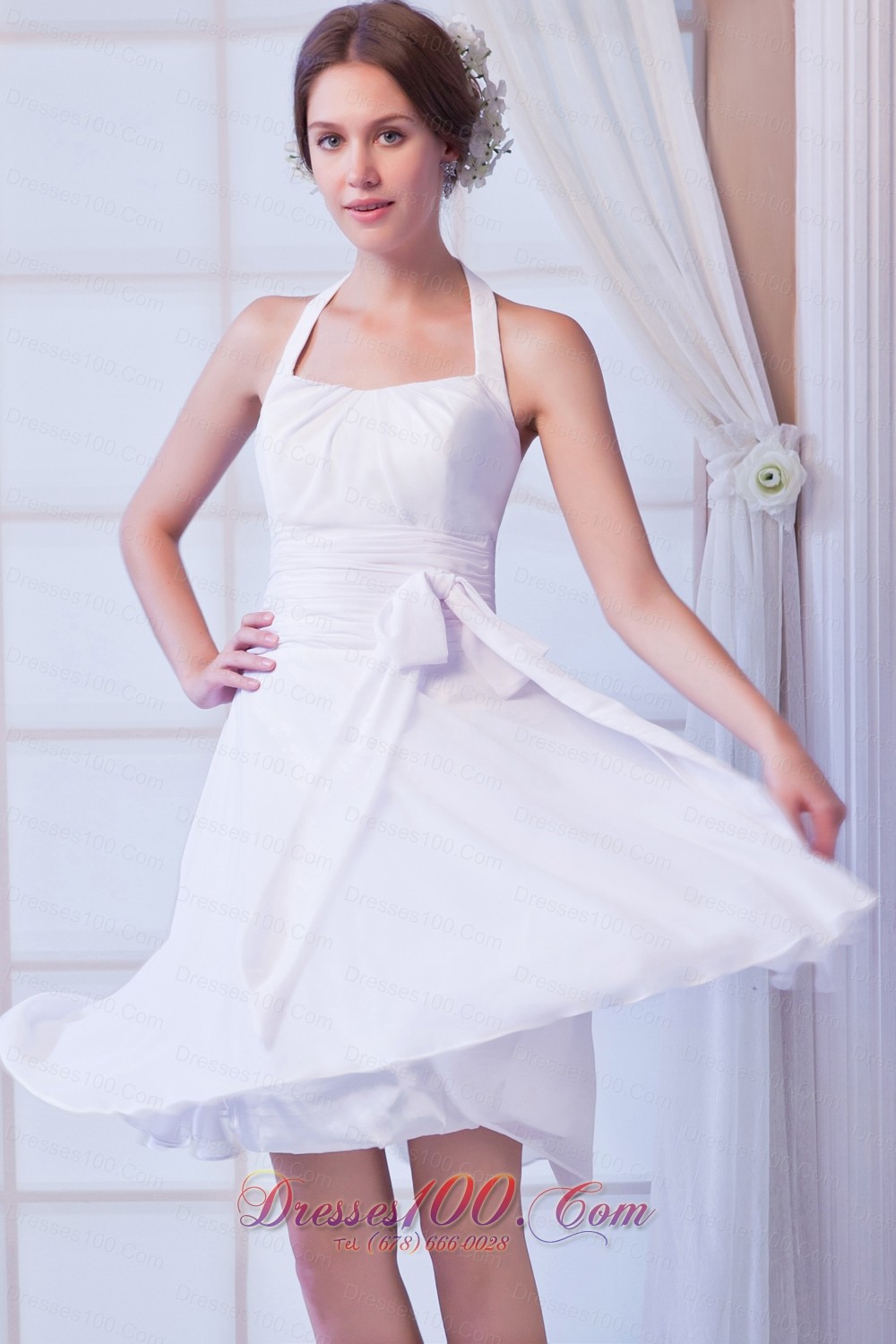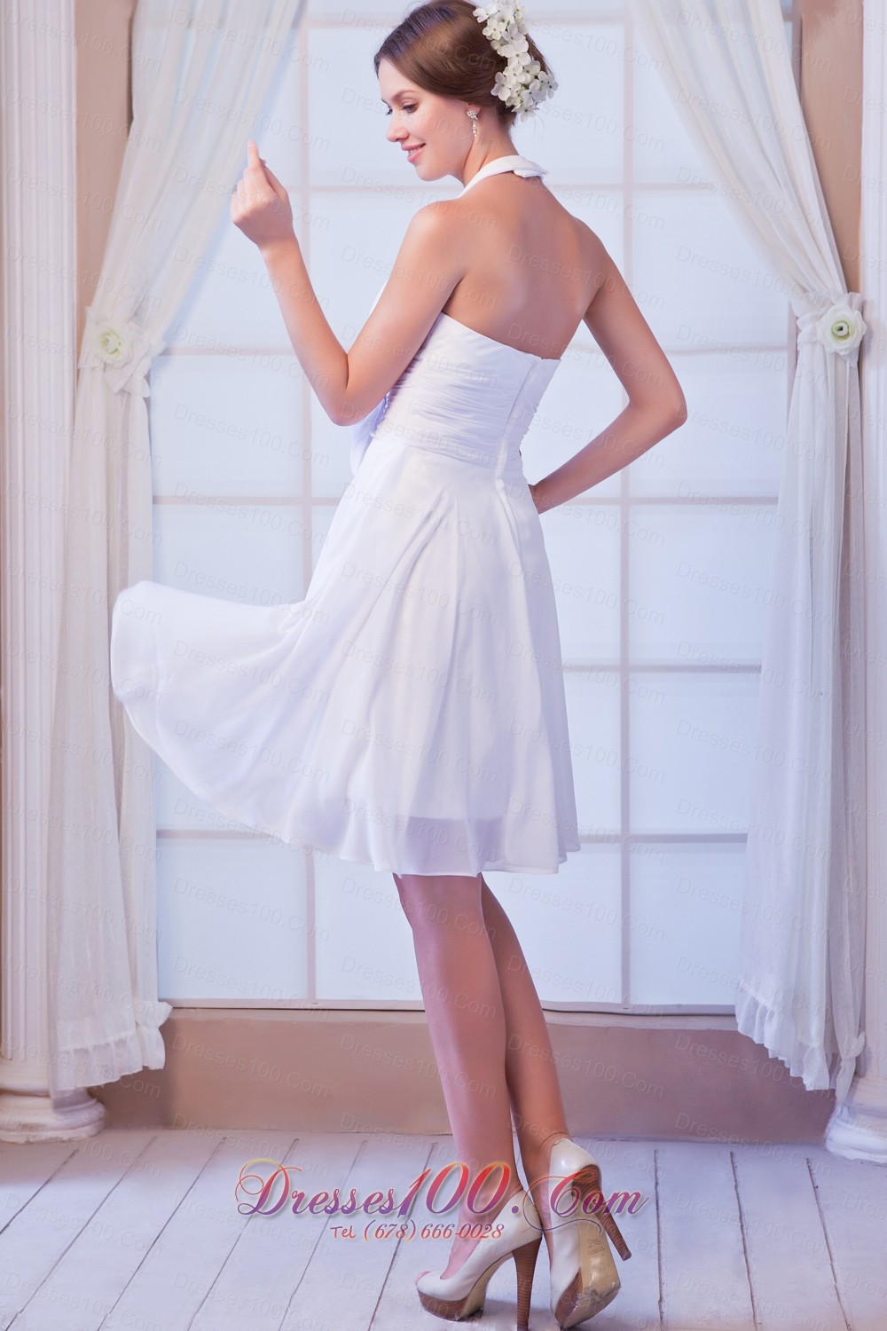 White A-line Halter Knee-length Chiffon Ruch Prom Dress