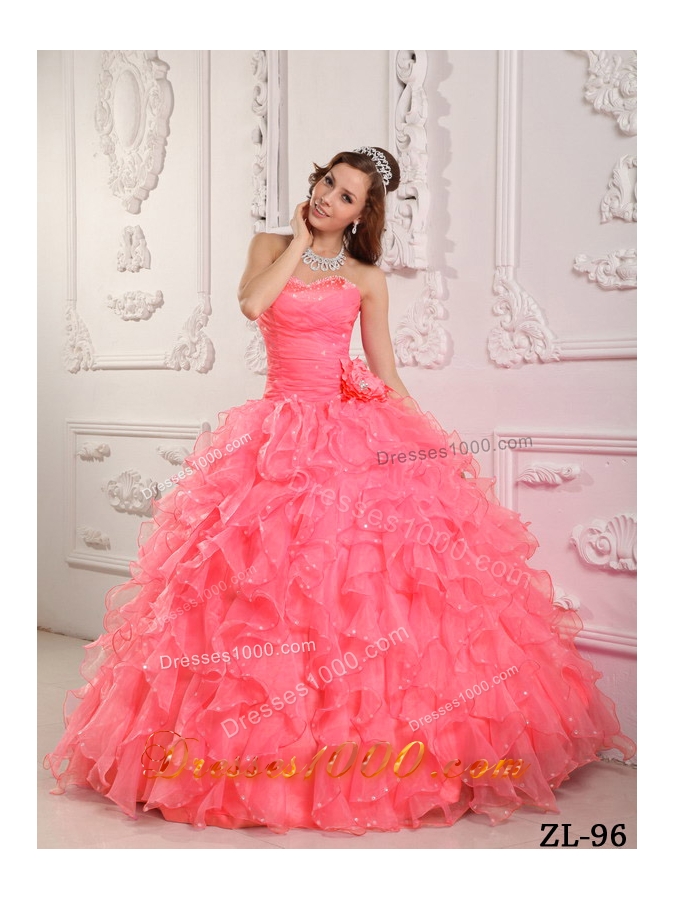 Romantic Ball Gown Sweetheart Beading Ruffles Watermelon Dresses For a Quinceanera
