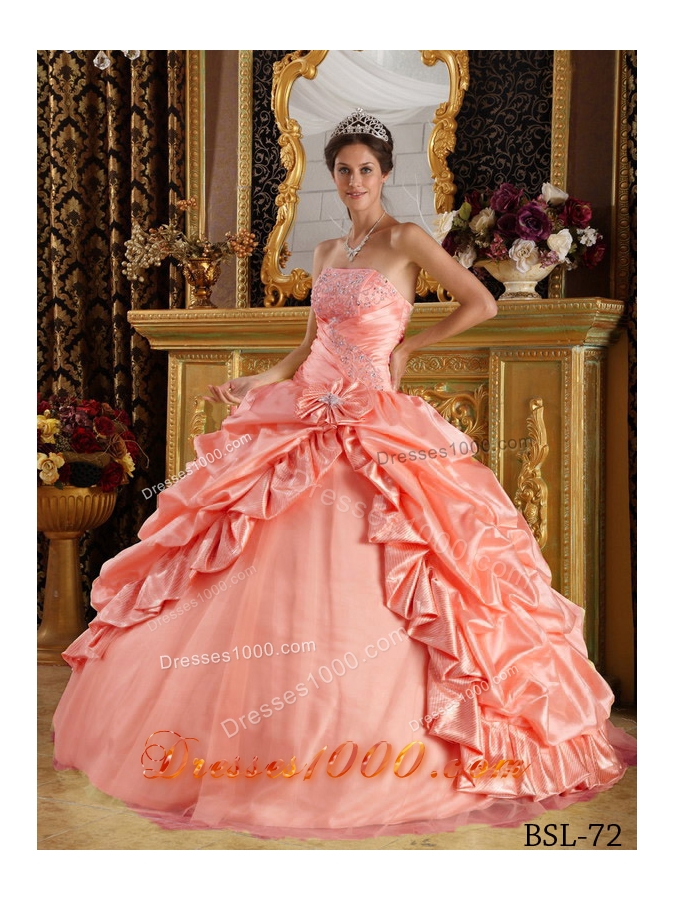 Watermelon Ball Gown Strapless Quinceanera Dress with Pick-ups and Appliques Beading