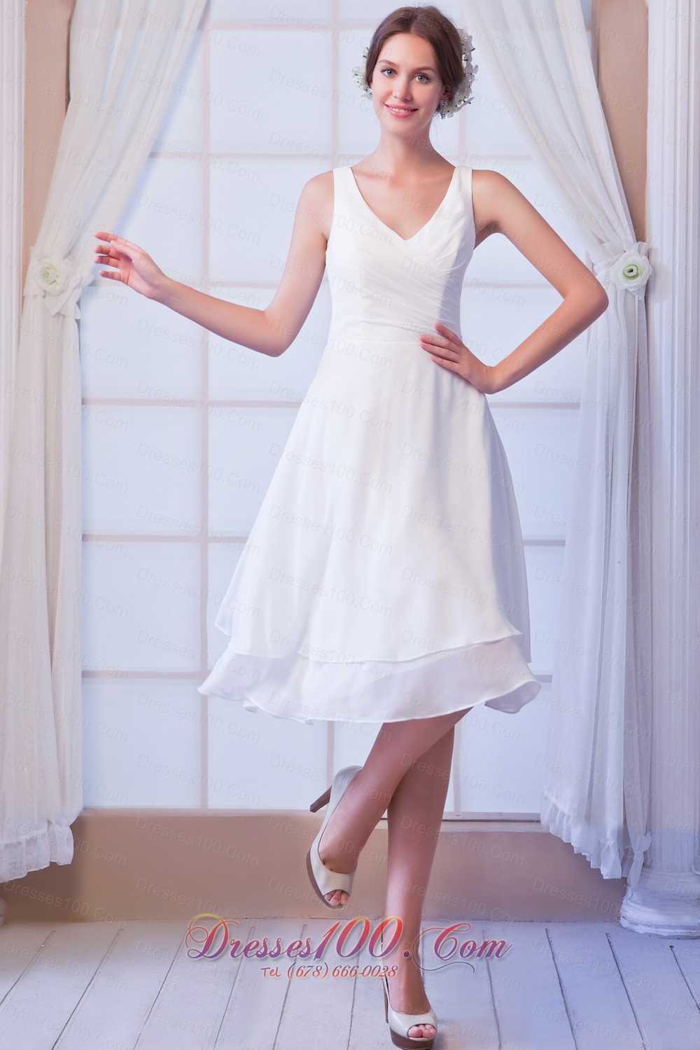 Simple A-line V-neck Knee-length Chiffon Wedding Dress