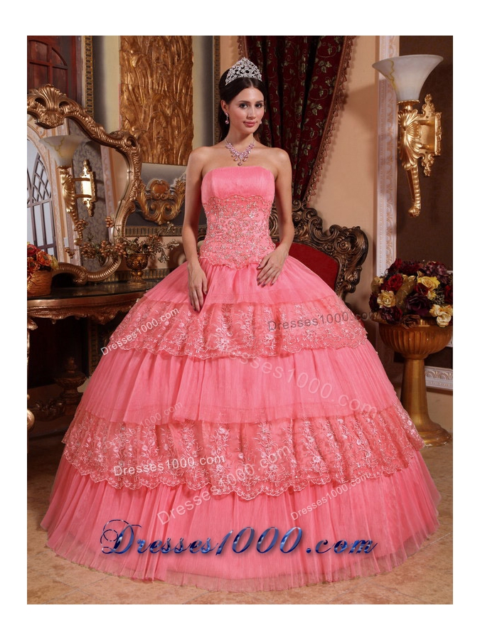 Watermelon Ball Gown Strapless Lace and Appliques Dresses Quinceanera for 2014