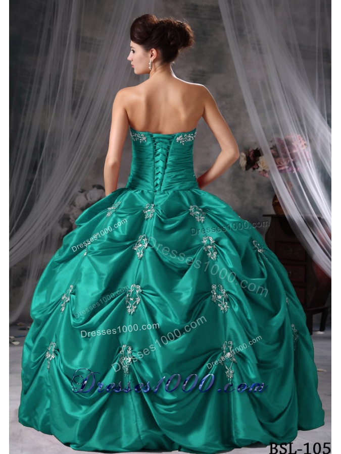 Puffy Strapless Turquoise Quinceaneras Dresses with Appliques and Pick-ups