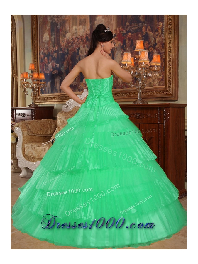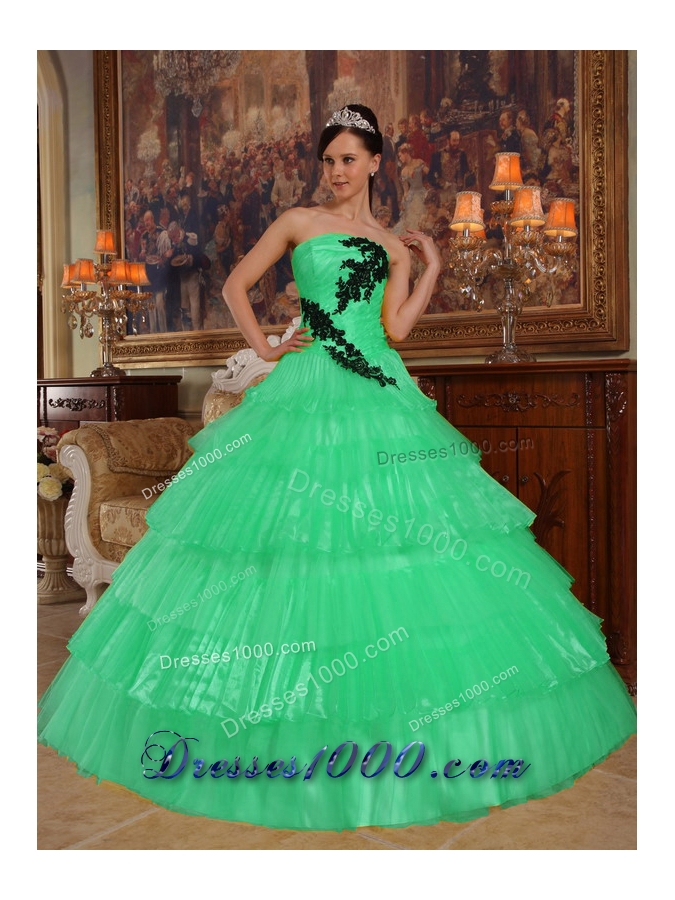 Turquoise Strapless Organza Quinceanera Dresses with Appliques and Layers