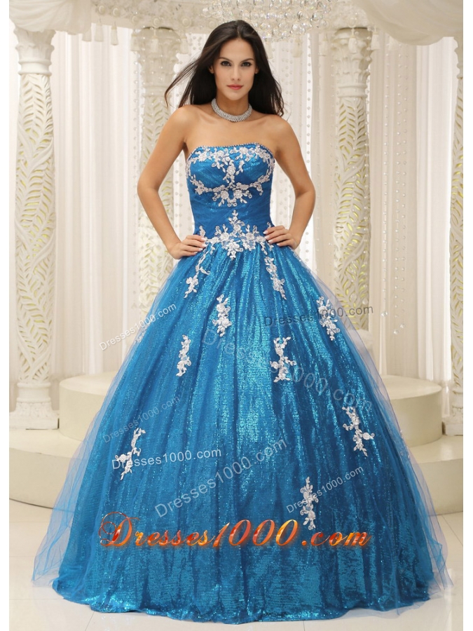 2014 Pretty A-line Quinceanera Dresses With Appliques Teal Paillette Over Skirt
