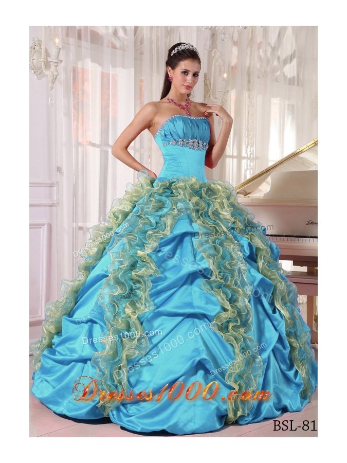 This straight neckline pink ball gown quinceanera dress is featured with the perfect combination of pick ups and ruffles at the bottom of the dress. And the light blue organza matches the pink color beautifully. The neckline is encrusted with pretty beading, which looks gorgeous and elegant.