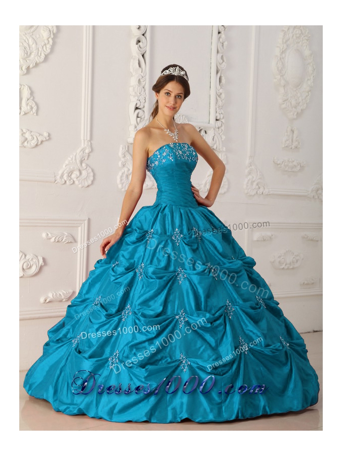Cheap Princess Strapless Appliques and Beading Long Teal Quinceanera Dresses