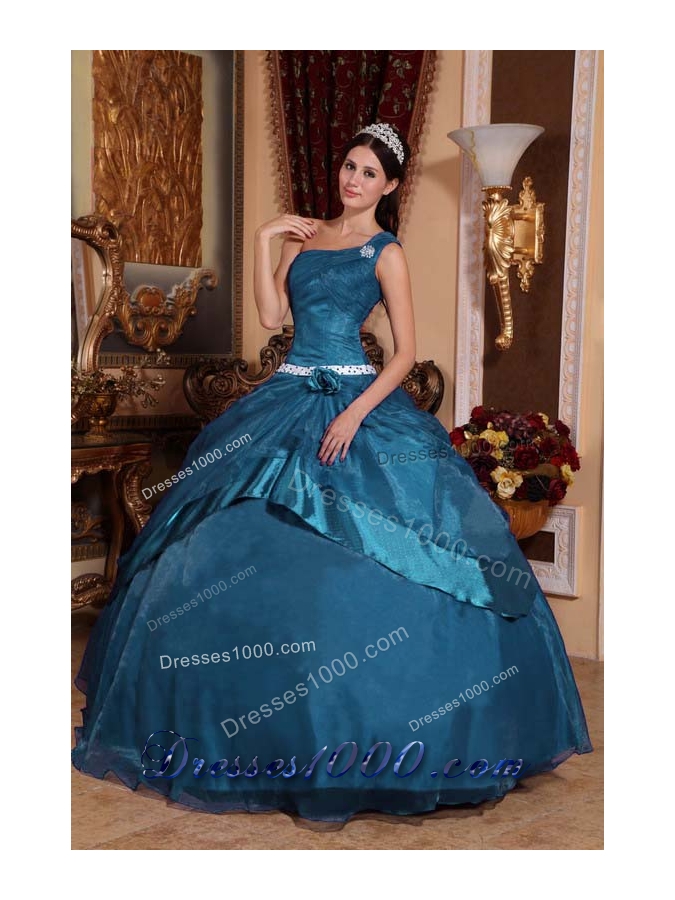 Cheap Teal Ball Gown One Shoulder Organza Beading Long Quinceanera Dresses