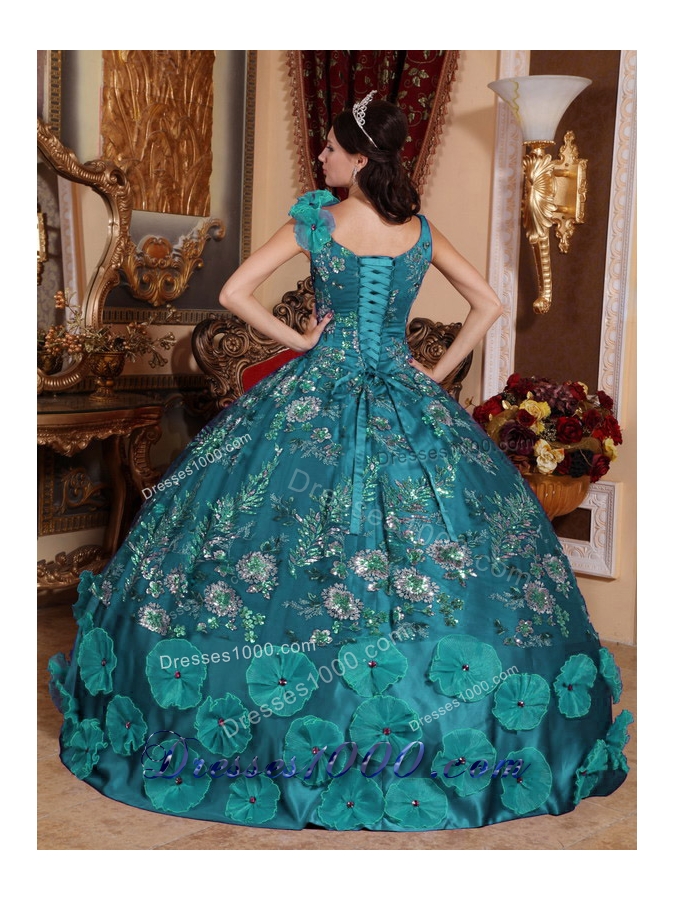 Dare to dazzle at your 2012quinceanera or holiday party in this quinceanera ball gown dress! Exquisite beaded embroidery appliques on the dress upgrades your taste and beautifies the dress. The top is accented with V-neck and straps ornated with a tulle flower. the puffy skirt accented with flora embroidery features flowers on the hem. A lace up corset style closure in the back secures the dress in place.Heads will turn as you arrive at your quinceanera or formal in this amazing ball gown!