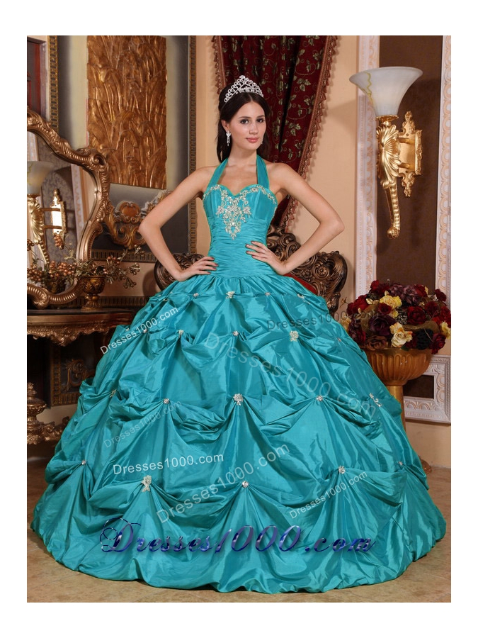 Teal Ball Gown Halter Top Floor-length Taffeta Appliques Quinceanera Dress