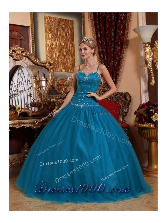 Spaghetti Straps Floor-length Tulle Beading Puffy Quinceanera Dresses