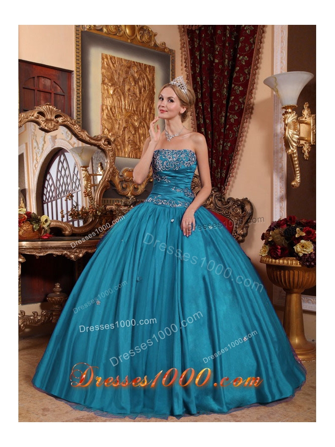 Puffy Strapless Taffeta and Tulle Appliques 2014 Quinceanera Dresses in Teal