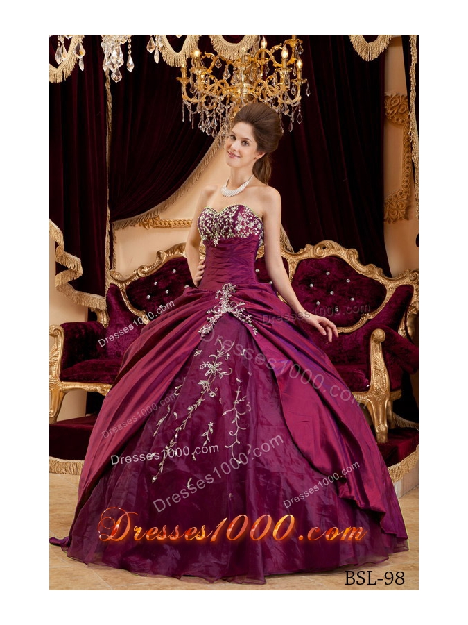 Make your Quinceanera celebration a red carpet event when you wear this Burgundy quinceanera dress.The strapless top with a sweetheart neckline and embellished appliques has a exquisite bodice. A layer of material falls over one side of the ball gown skirt that is accented with a delicate floral appliques in the middle section.The corset back completes this fabulous design.