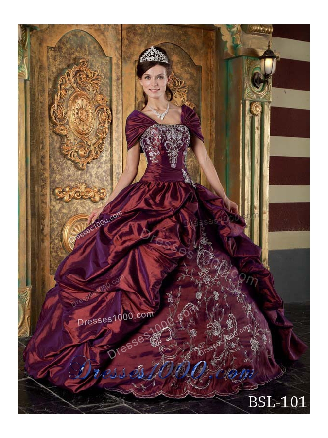 Burgundy Taffeta Strapless Quinceanera Gown Dress with Embroidery