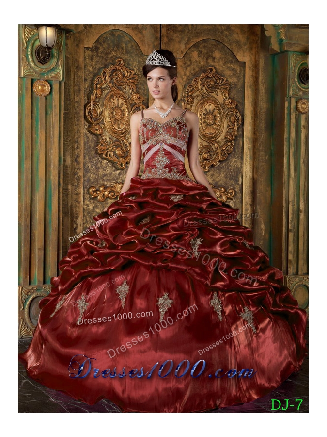 Spaghetti Straps Burgundy Quinceanera Gowns with Appliques and Pick-ups